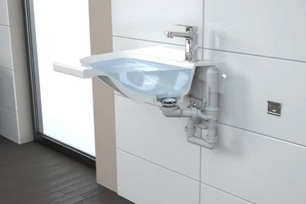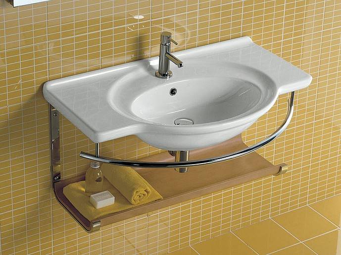 Cuvette en céramique inclinable. Dans ce cas, des supports spéciaux doivent être fixés sur les parois latérales de l'évier.