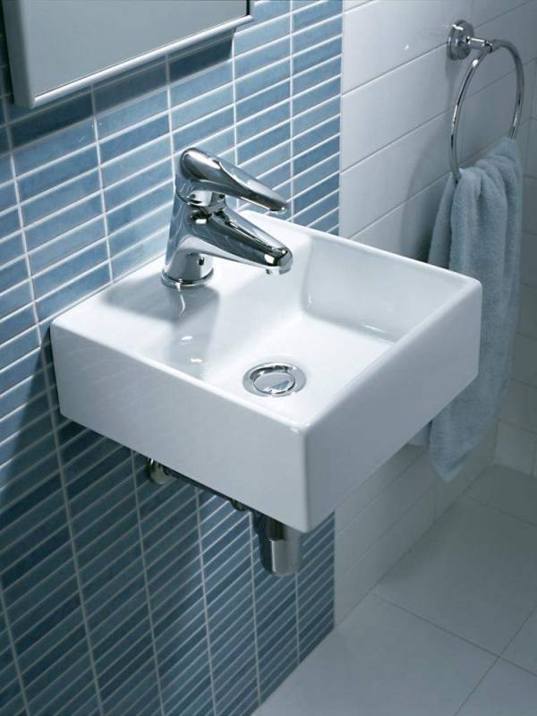 • Suspendu (console). Ils sont fixés au mur avec des supports ou d'autres attaches. Le principal inconvénient est que les raccords de plomberie et le siphon restent visibles. L'avantage est le gain de place. Il existe également des éviers plats suspendus sous lesquels vous pouvez installer une machine à laver.