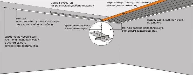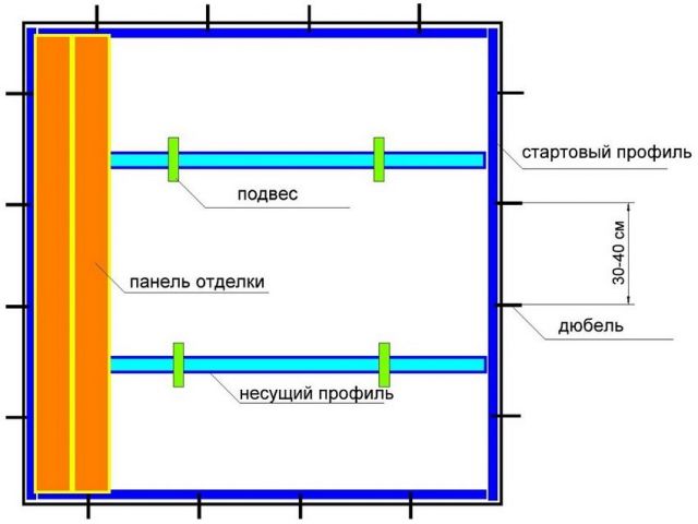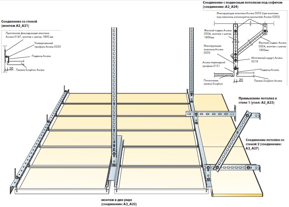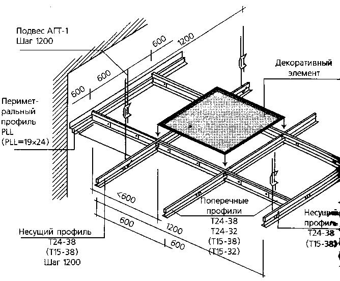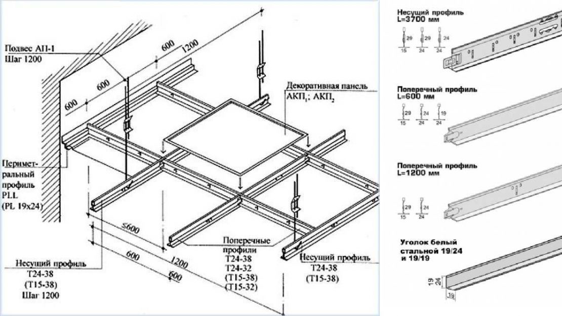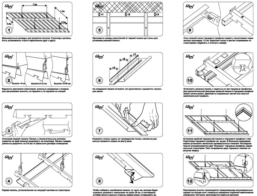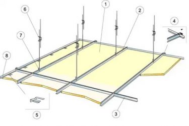 L'installation d'un plafond suspendu se fait mieux avec un assistant. Tout d'abord, le profil principal est fixé le long du périmètre des murs, puis, sur les suspensions, des lattes supplémentaires sont fixées. Sur la base du dessin, les premiers panneaux sont fixés, puis les suivants.