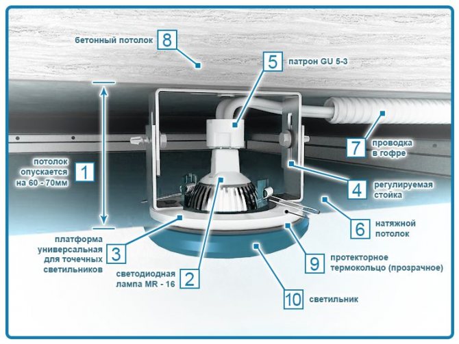 - Il est possible d'installer n'importe quel type d'éclairage - à la fois les luminaires principaux et l'éclairage supplémentaire, en fonction du projet initial.