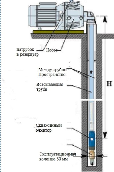 - Pour augmenter la profondeur de la prise d'eau à plus de 9 mètres, vous pouvez utiliser un éjecteur externe, qui est abaissé sous l'eau avec un tuyau. Dans ce cas, lorsque la pompe est en marche, une partie de l'eau tombe dans l'éjecteur, la pression dans le tuyau augmente, ce qui augmente la pression. Mais le fort bruit généré par l'installation ne permet pas d'utiliser cette option tout le temps.
