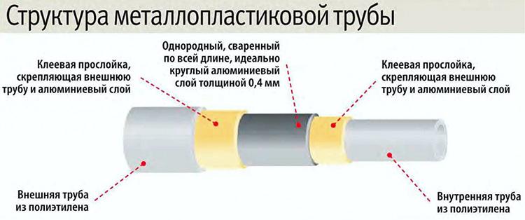 Un tuyau métal-plastique (PEX-AL-PEX) se compose de deux couches de polyéthylène "réticulé" et d'une couche de renfort en aluminium de 0,2 à 0,3 mm d'épaisseur, qui sont interconnectées avec de la colle