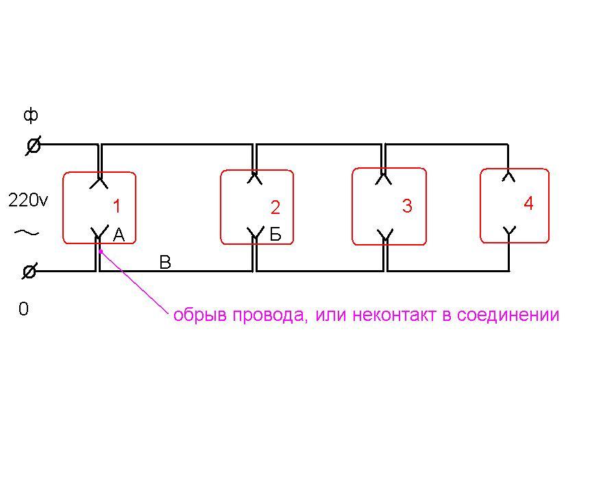 La méthode série (ou boucle) est utilisée lorsque plusieurs prises installées les unes après les autres sont allumées sur une ligne donnée. Les contacts individuels (phase et zéro) sont connectés les uns aux autres en parallèle, la méthode série est appelée uniquement en raison de l'ordre dans lequel les nœuds de prise sont situés.
