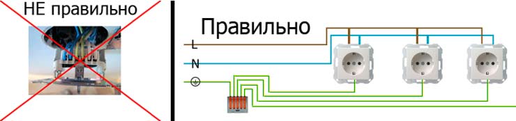Voyons comment connecter une prise ou un bloc de plusieurs unités. Vous pouvez connecter des prises électriques en parallèle via une boîte de jonction ou à l'aide de bornes, cette méthode est également appelée connexion en guirlande. Lors de la connexion de prises électriques avec une boucle, le câble est connecté à la première unité du bloc et le câble du bloc suivant est alimenté par le dernier. La connexion en guirlande nécessite des déconnexions de prise de courant indépendantes obligatoires. Pour ce faire, les conducteurs sont connectés aux conducteurs neutres par des bornes ou par soudure. Le zéro et la phase sont connectés à la première prise électrique. Une pince est placée sur le fil de terre, à partir de laquelle un fil de terre est connecté à chacune des unités. Pour connecter le deuxième bloc de prises, vous devez connecter la phase et le zéro de travail de la dernière unité du premier bloc, et le fil de terre à la compression.