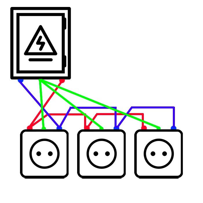 Ceux. si vous allez installer un bloc de 3 prises et les connecter en série, il est strictement interdit d'allumer simultanément une charge supérieure à 16A dans chacune de ces prises (cette situation est pertinente en cuisine). Dans le même temps, si vous décidez de connecter les prises avec une étoile, il sera possible de connecter une charge allant jusqu'à 16A à chacune d'elles. L'essentiel est que le câble puisse supporter la machine installée sur cette ligne de sortie.