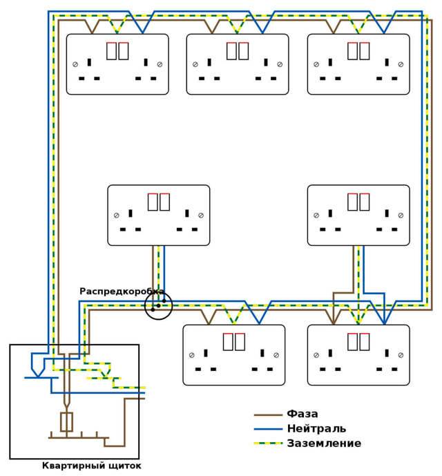 La mise à la terre est installée dans chaque prise, il y a suffisamment d'espace pour poser les fils. Cette méthode est considérée comme fiable et garantit une protection. Il est indispensable lorsqu'une installation supplémentaire de plusieurs prises est requise. Exclut la réalisation de travaux de grande envergure. Utilisez-le pour des charges légères dans un appartement ou une maison, dans des conditions normales.