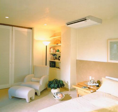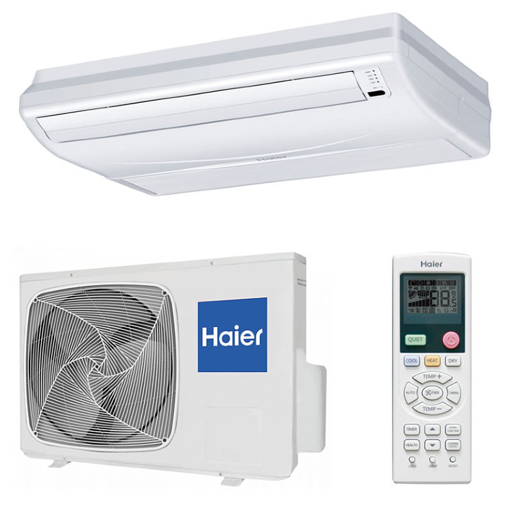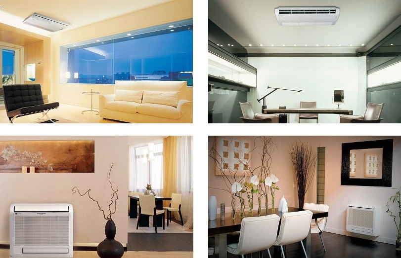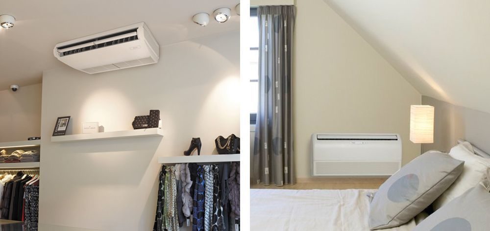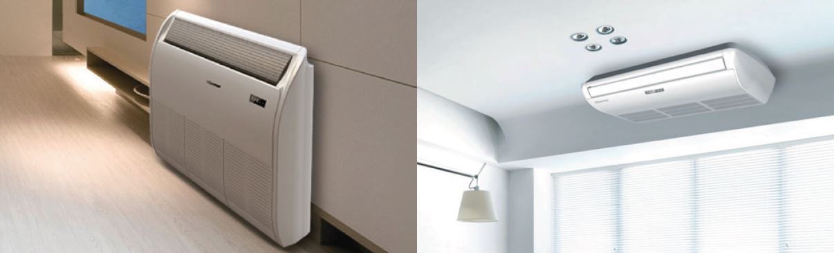 - Sol et plafond. Fixé à la plaque de plafond ou installé au sol près du mur. En règle générale, il s'agit de types de climatiseurs semi-industriels. Ils sont pratiques car ils ne prennent pas de place sur les murs et peuvent répartir uniformément les flux refroidis dans toute la pièce.