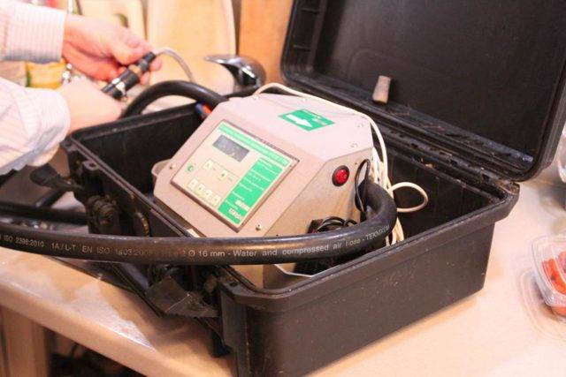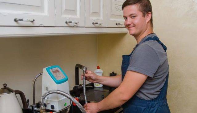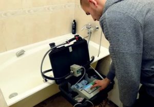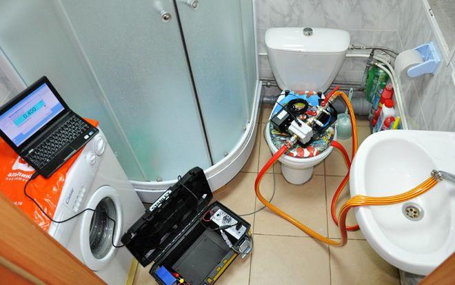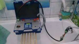 - Si l'appareil est en bon état de fonctionnement, le spécialiste commence à utiliser une installation d'étalonnage spéciale. Il y a deux tuyaux qui en partent. Le premier est fixé à une extrémité sur un robinet installé dans la cuisine ou dans la salle de bain, le second est simplement tiré dans l'évier.