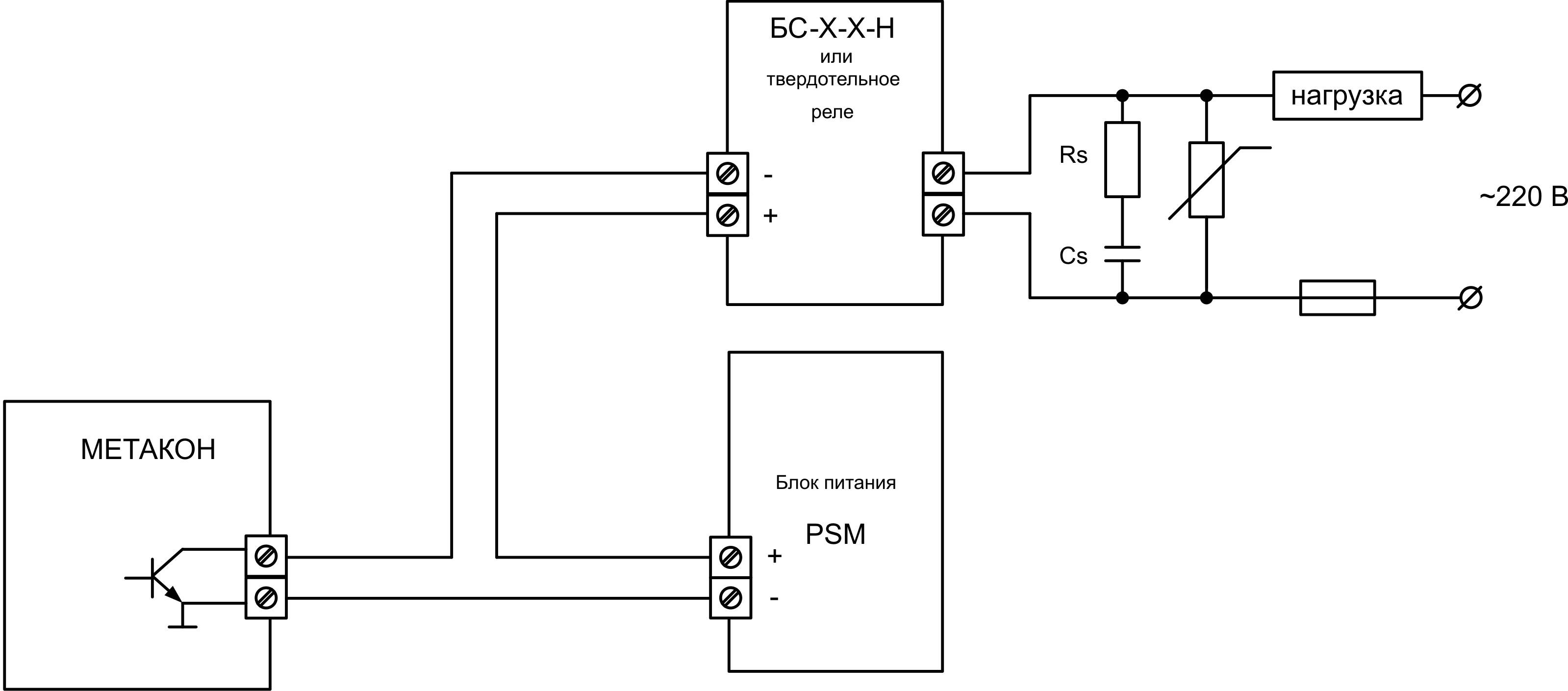 Pour augmenter la résistance de l'appareil au bruit impulsionnel, un circuit externe est placé en parallèle avec les contacts de commutation, composé d'une résistance et d'une capacité connectées en série (circuit RC). Pour une protection plus complète contre la source de surtension côté charge, il est nécessaire de connecter des varistances de protection en parallèle sur chaque phase du SSR.
