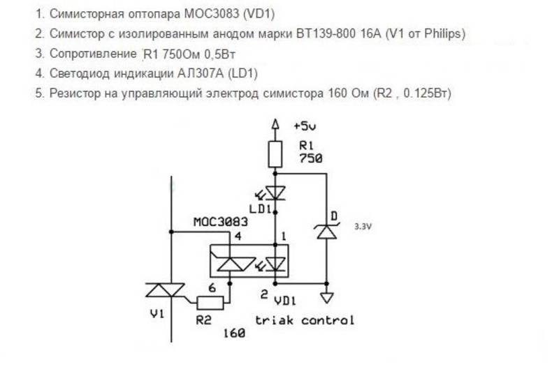Le triac est protégé contre les surtensions via un condensateur de 100 nF et une résistance de 47 ohms. Un FET BF256A a été ajouté pour permettre une commutation stable d'un relais statique avec différentes tensions de commande. Il agit comme une source de courant. La diode 1N4148 est installée pour protéger le circuit en cas d'inversion de polarité. Ce circuit peut être utilisé dans divers appareils, avec une puissance allant jusqu'à 1,5 kW, bien sûr, si vous installez le thyristor sur un gros radiateur.