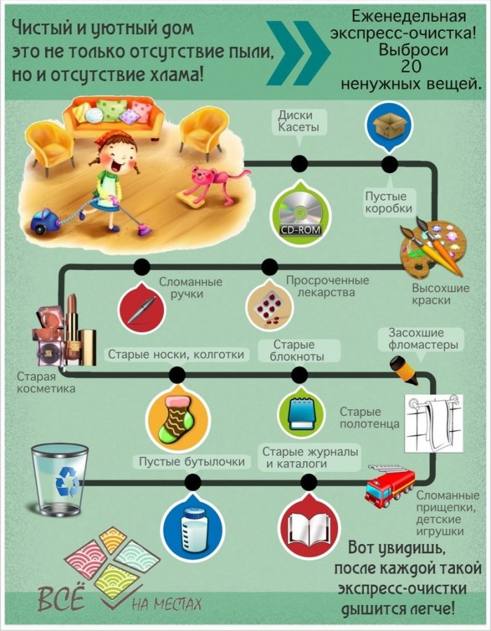 Si vous faites un mini-nettoyage tous les jours, la maison sera toujours propre et confortable. Chaque chose dans la maison doit avoir sa place et chaque jour, elle doit être soigneusement pliée.