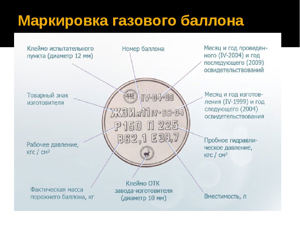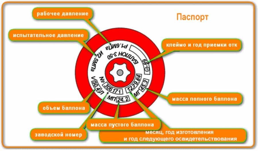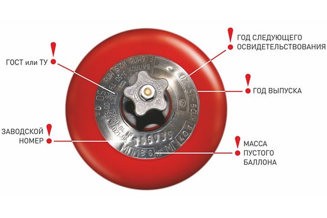 L'examen des bouteilles s'accompagne d'un marquage conforme aux règles régissant les règles d'apposition des étiquettes.La marque du point qui a effectué le contrôle, la date de la conduite et la date prévue de la prochaine enquête sont appliquées sur la plaque de marquage du fabricant par la méthode de gaufrage. Le timbre est apposé sur une ligne en chiffres arabes dont la hauteur ne doit pas être inférieure à 8 mm. L'heure fixée pour la prochaine inspection peut être dupliquée par une inscription blanche sur la génératrice extérieure du cylindre, préalablement peinte en émail rouge. De plus, des étiquettes d'avertissement blanches doivent être apposées sur la génératrice extérieure de la bouteille.