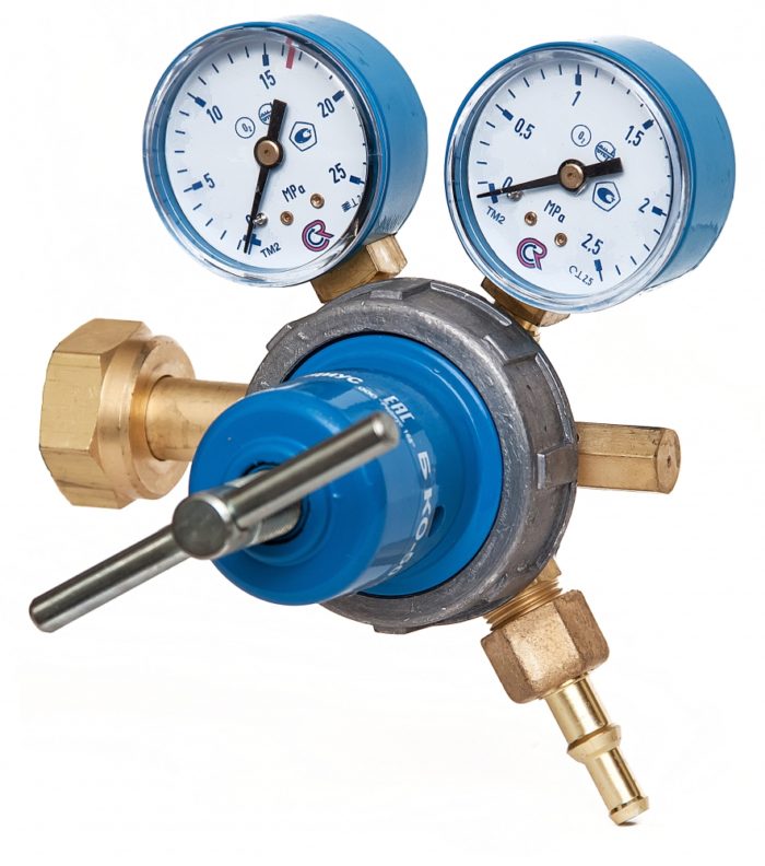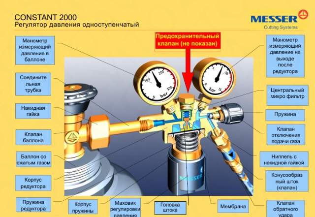 Des manomètres à ressort sont installés sur les réducteurs d'oxygène et d'acétylène. Le manomètre du réducteur de gaz est connecté aux chambres de haute pression et de travail avec une clé, des joints en fibre et en cuir sont utilisés pour sceller la connexion.