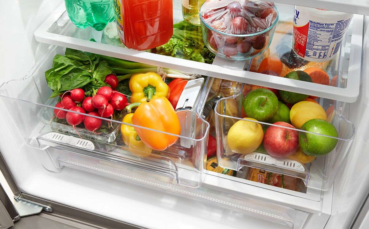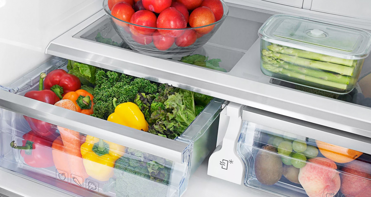 Les légumes, les fruits et les légumes verts sont stockés sur l'étagère du bas ou dans des tiroirs spéciaux.