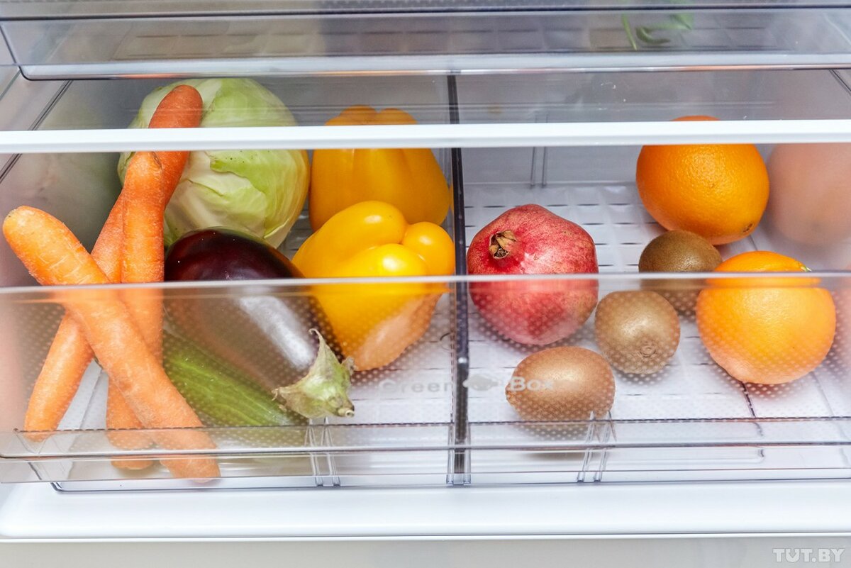 Nous stockons les légumes et les fruits dans des plateaux de réfrigérateur spécialement conçus, les légumes - dans l'un, les fruits - dans un autre plateau.