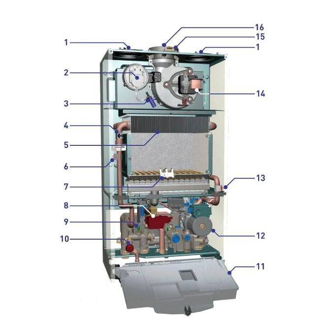 Si tous les composants impliqués dans le fonctionnement de la chaudière sont classés en fonction de leur fonction, ils peuvent être répartis dans les groupes suivants : dispositifs du système de contrôle, dispositifs du système hydraulique, brûleur et unité d'alimentation en gaz, cheminée, dispositifs de contrôle de la chaudière, multi systèmes de sécurité de niveau supérieur.