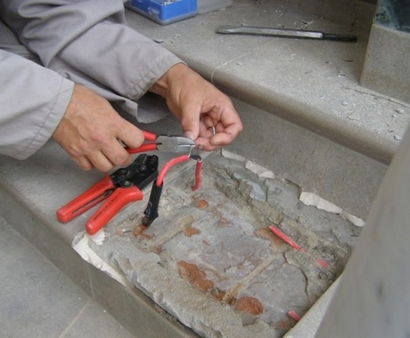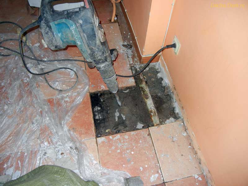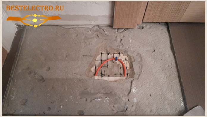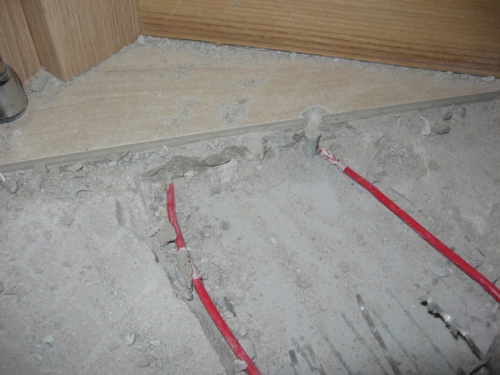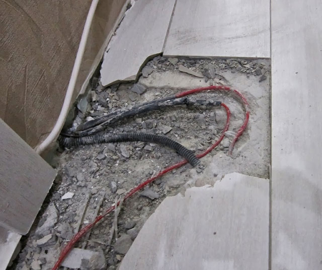 Pour trouver l'emplacement d'un circuit ouvert, vous devez utiliser un détecteur spécial pour rechercher le câblage (par exemple, le dispositif de signalisation E-121) ou une caméra thermique. À l'aide de ces appareils, vous pouvez déterminer la zone où le câble est endommagé. Ensuite, les travaux de démontage doivent commencer: retirez le revêtement de sol et retirez la chape (si elle a été réalisée). Si des carreaux de céramique sont utilisés comme matériau de revêtement, ils doivent être enlevés au-dessus de l'espace avec un marteau.