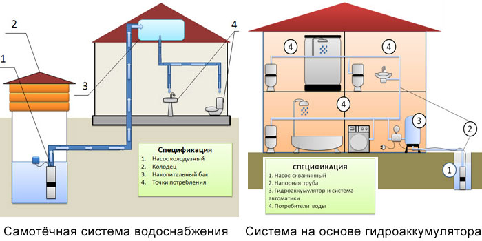 Le nombre de nœuds affecte également le volume des réservoirs et le diamètre des tuyaux de décharge. Si la maison utilise un bain, le volume de liquide traversant les tuyaux sera petit, respectivement, vous pouvez utiliser un tuyau d'un diamètre plus petit.