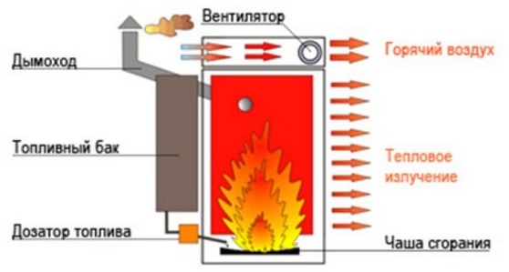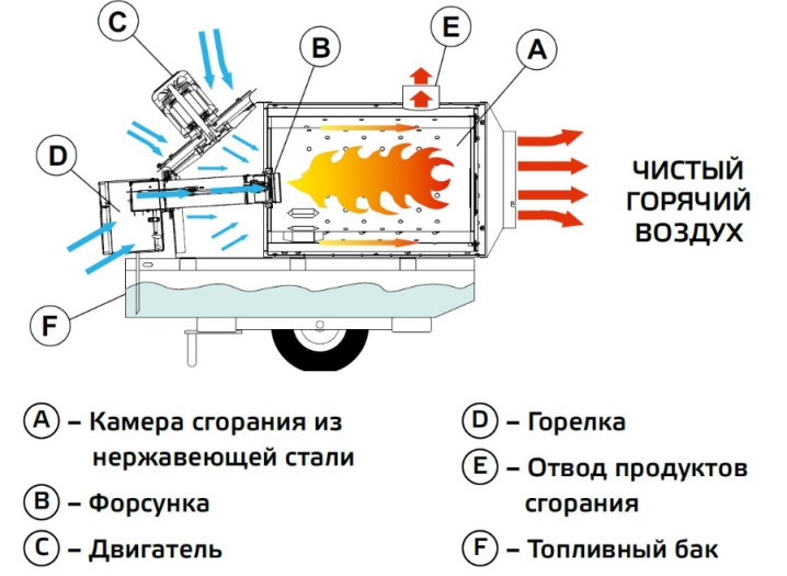 La base des appareils à chauffage direct est un principe élémentaire de fonctionnement: un brûleur est disposé à l'intérieur du corps, à travers la flamme duquel passe l'air soufflé par un ventilateur. En conséquence, il se réchauffe, puis éclate, dégageant de la chaleur dans l'environnement.