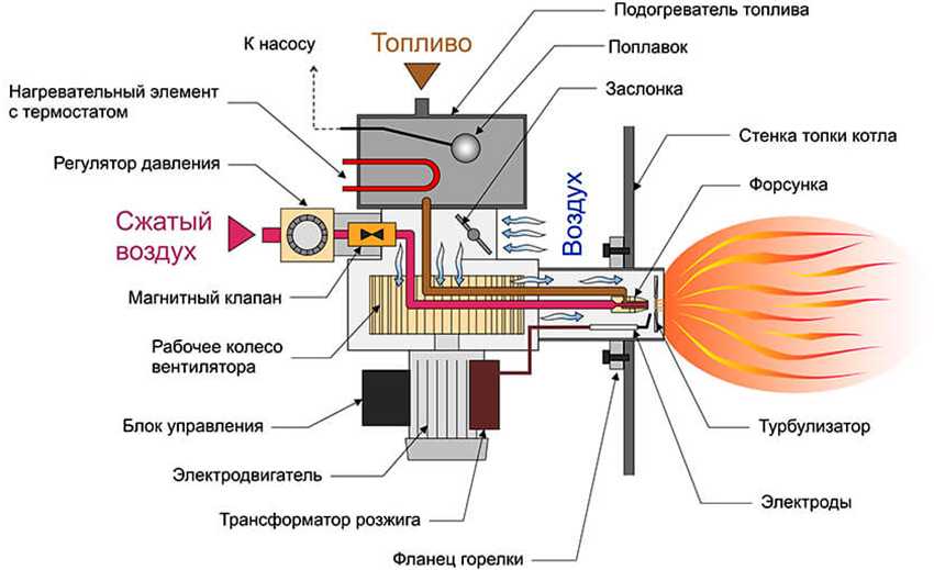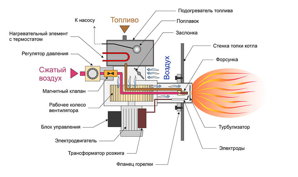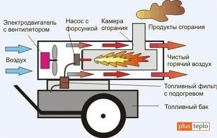 L'élément inférieur de cette conception est le réservoir de carburant diesel. Un pistolet est directement installé sur le dessus, dans lequel se trouvent un ventilateur et une chambre de combustion. Le carburant pénètre dans la chambre et le ventilateur transmet de l'air chauffé. Pour allumer et transférer le carburant, une pompe à carburant, un tuyau de raccordement, une buse et un filtre seront nécessaires.Un moteur électrique est relié au ventilateur.
