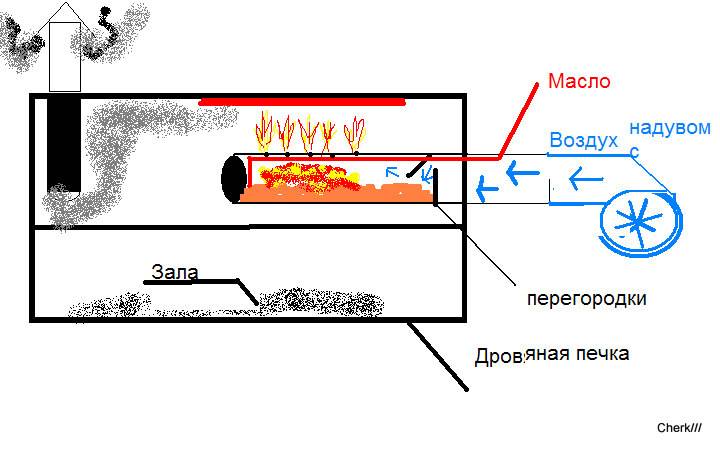 La chambre de combustion est installée au centre en haut du corps. Il s'agit d'un cylindre en fer d'un diamètre environ 2 fois plus petit que le diamètre du corps. Les produits de la combustion du carburant sont évacués de la chambre à l'aide d'un tuyau installé verticalement.
