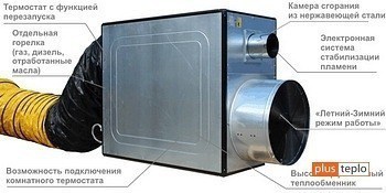 Les avantages et les inconvénients de l'appareil dépendent en grande partie du type de générateur d'énergie thermique - un élément chauffant électrique ou un brûleur à combustible liquide. Chaque modèle a des caractéristiques distinctives d'un pistolet électrique ou diesel, respectivement.