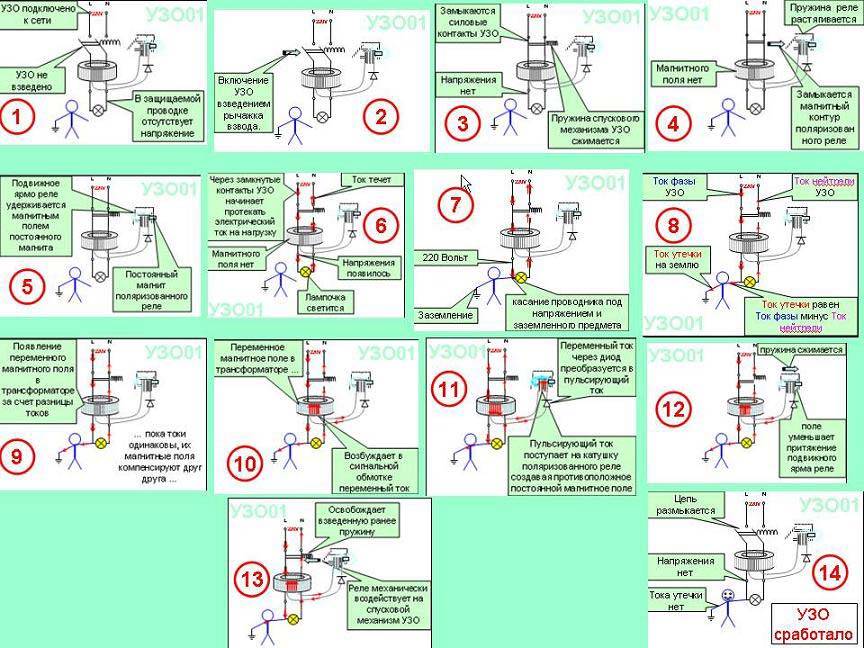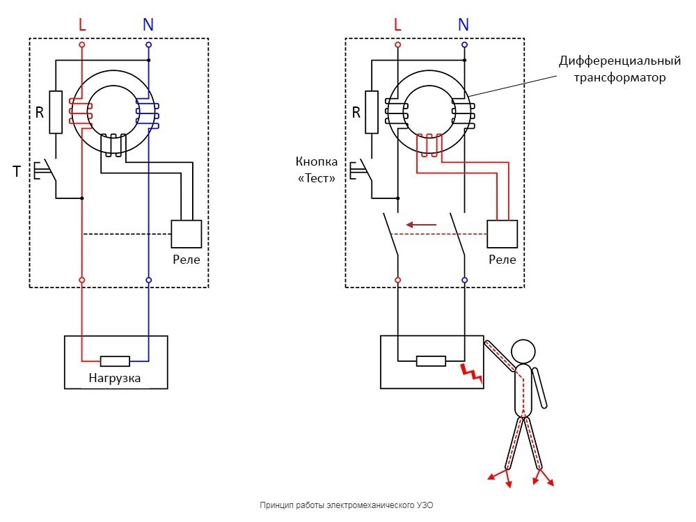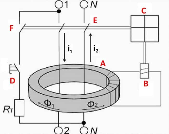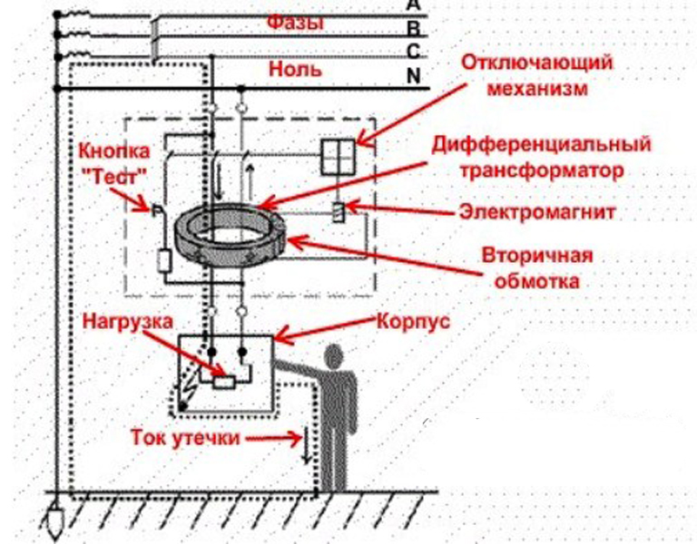 En cas de détérioration de l'isolation, due à la différence de potentiel entre les fils de terre, de neutre et de phase, des fuites de courant se produisent. L'apparition d'une fuite perturbe l'équilibre dans les fils, en conséquence, une violation de l'égalité des flux électromagnétiques est observée dans le noyau.