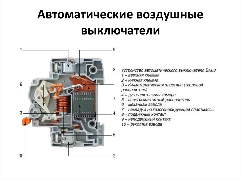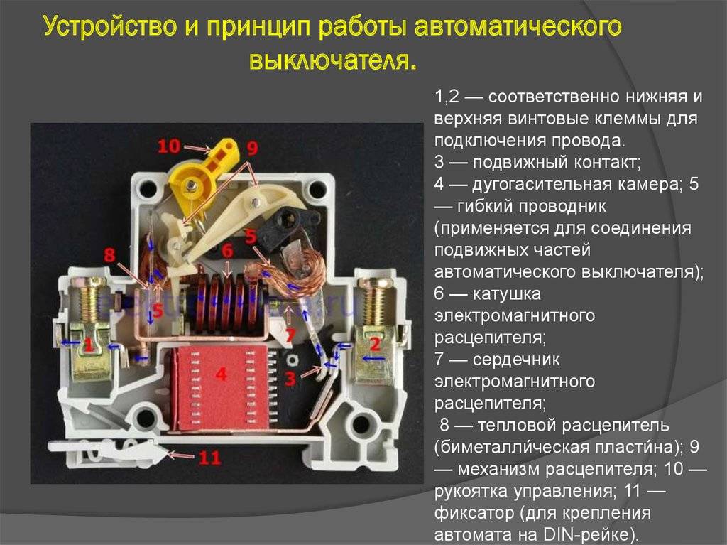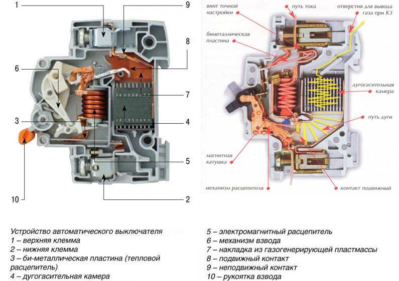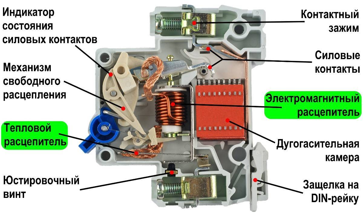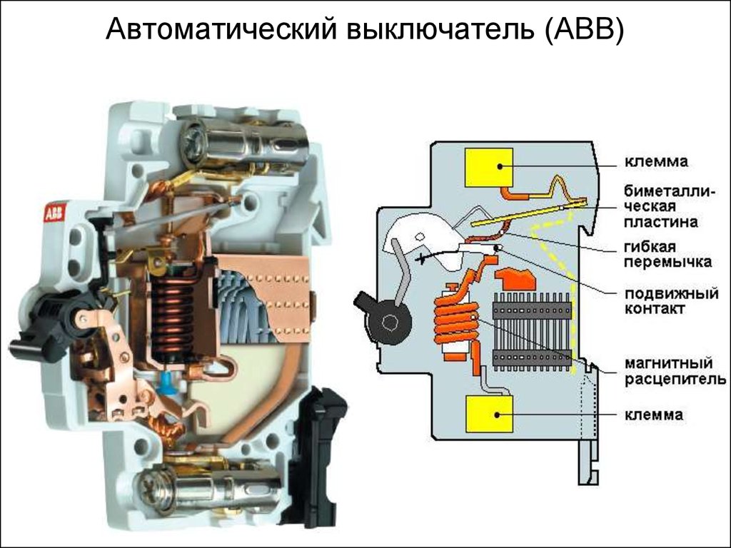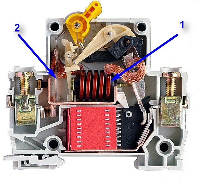 - Déclenchement électromagnétique. Ce dispositif est constitué d'un inducteur équipé d'un noyau métallique mobile.Le noyau est relié à un mécanisme de rappel à ressort, qui assure une fermeture fiable des contacts du disjoncteur en fonctionnement normal du circuit électrique. Le déclencheur électromagnétique est activé dans les cas où un courant de court-circuit circule dans le circuit.