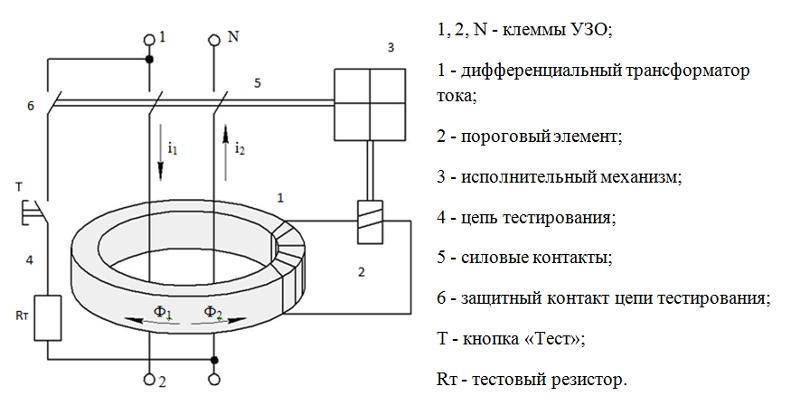 Dans un difavtomat, le circuit de fil de phase et de neutre traverse le noyau du transformateur. Lorsque les courants électriques dans les fils sont égaux, le flux résultant dans le noyau est nul. Il n'y a pas de courant dans les circuits secondaires, par conséquent, le relais est inopérant.