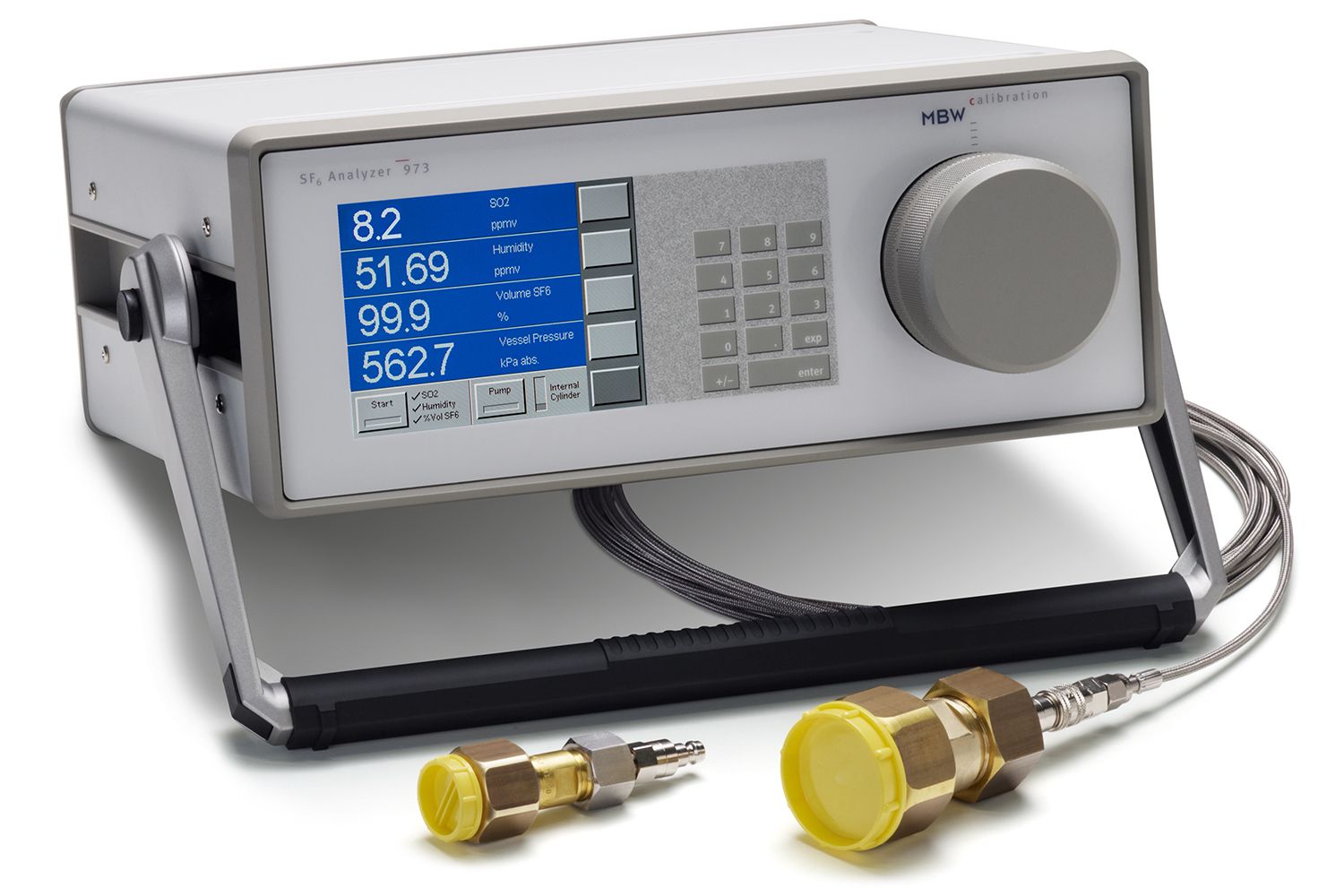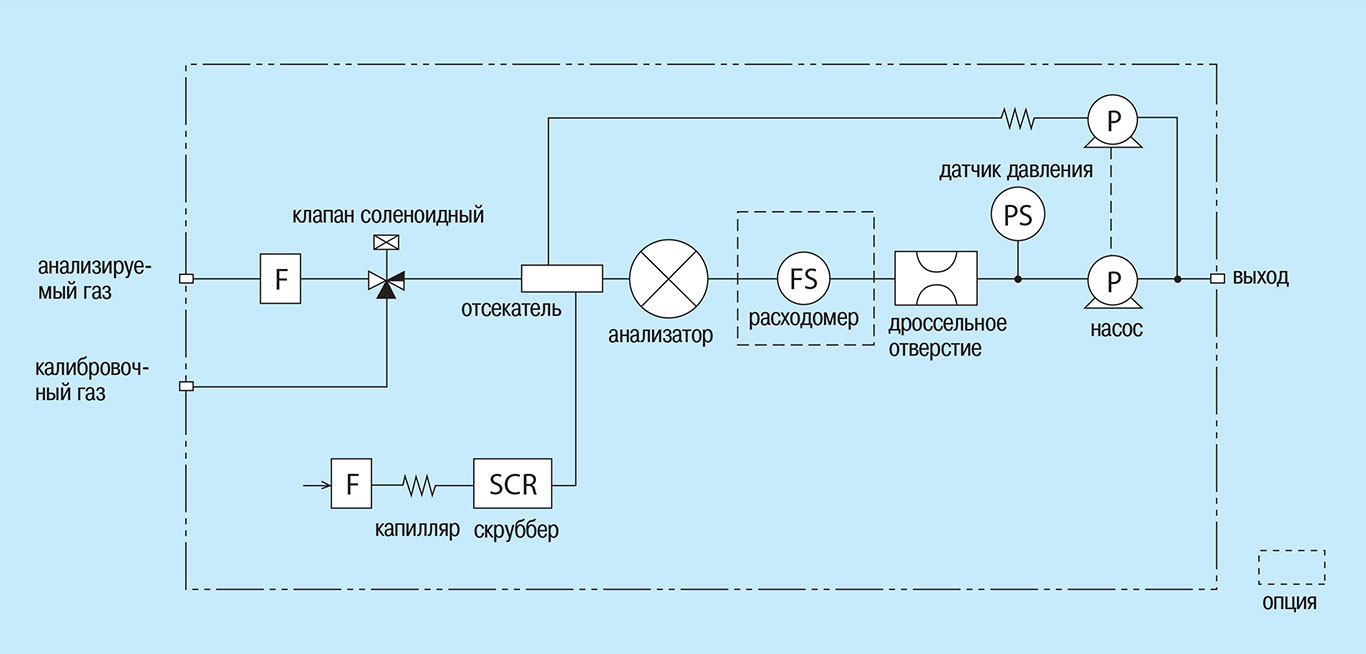 Le gaz à analyser est prélevé de la chaudière à travers un filtre en céramique, d'où il pénètre dans l'unité d'équilibrage de l'humidité, où il est soit séché (avec élimination des condensats), soit humidifié. Un manomètre est utilisé pour contrôler le vide dans le système.