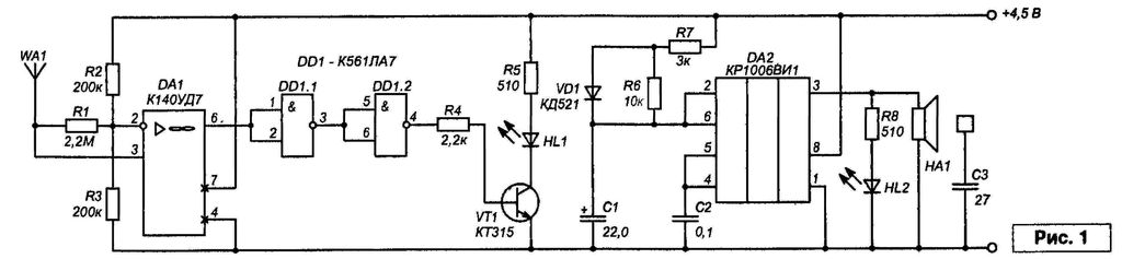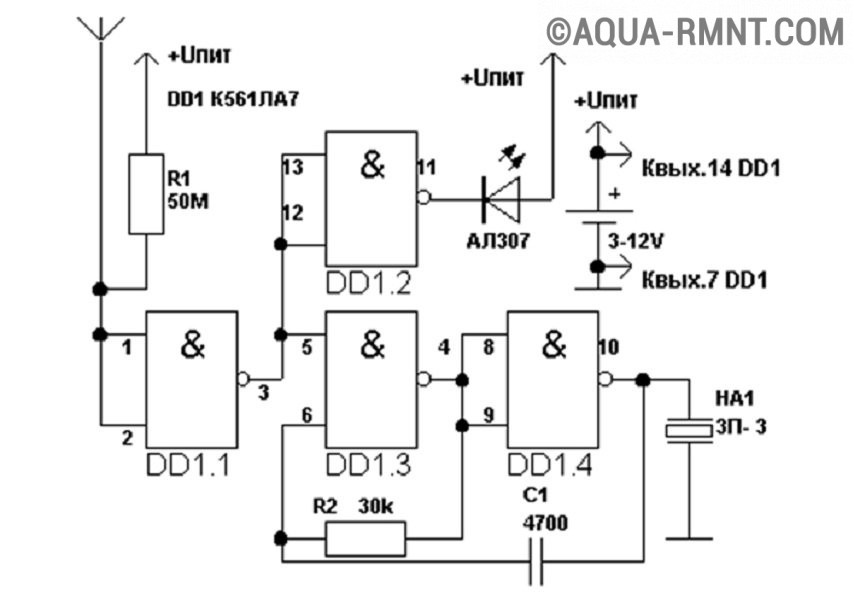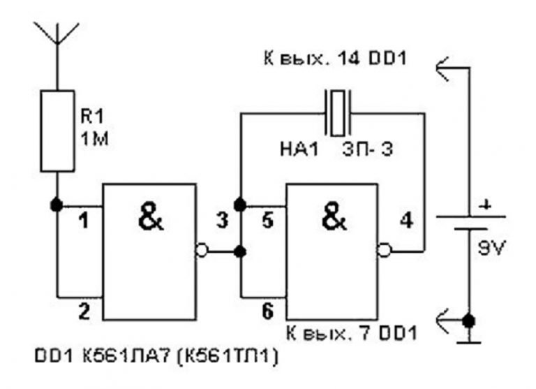 De plus, pour le travail, vous aurez besoin d'un fer à souder de faible puissance jusqu'à 25 W, afin de ne pas surchauffer le microcircuit; colophane; souder; pinces coupantes. Avant de procéder à l'assemblage, examinons de plus près les principaux éléments. La pièce principale sur laquelle s'effectue l'assemblage est le microcircuit de type soviétique K561LA7. On peut le trouver sur le marché de la radio ou dans des stocks anciens.Le microcircuit K561LA7 est sensible aux champs statiques et électromagnétiques créés par les appareils électriques et les conducteurs. Le niveau de courant dans le système contrôle la résistance située entre le circuit intégré et l'antenne. Nous utilisons un fil de cuivre unipolaire comme antenne. La longueur de cet élément affecte la sensibilité de l'appareil, il est sélectionné expérimentalement.