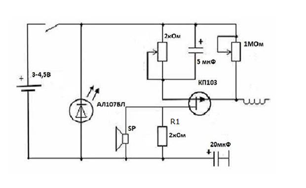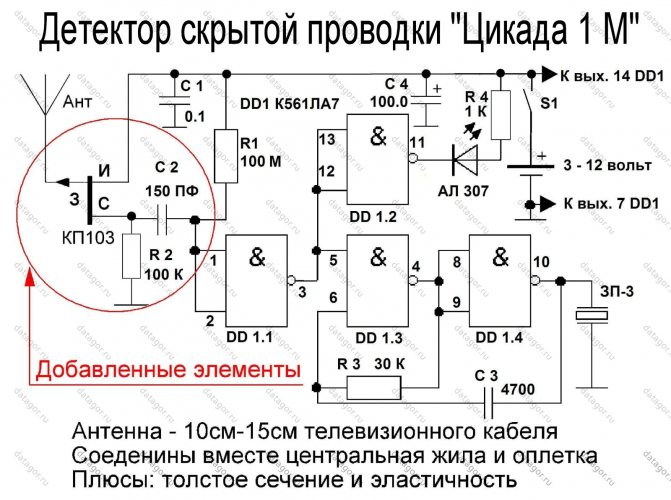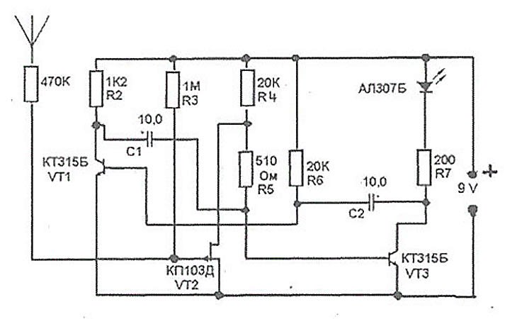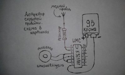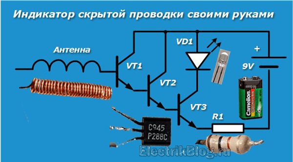 Un dispositif simple de recherche de câblage caché peut être fabriqué indépendamment et pour cela, il n'est pas nécessaire d'être un spécialiste en ingénierie radio. Un tel détecteur primitif n'a qu'une seule fonction, mais n'est pas inférieur en précision de mesure à de nombreux modèles sur le marché (par exemple, un tournevis indicateur avec une fonction de recherche de câblage). Il est assemblé selon le schéma suivant :