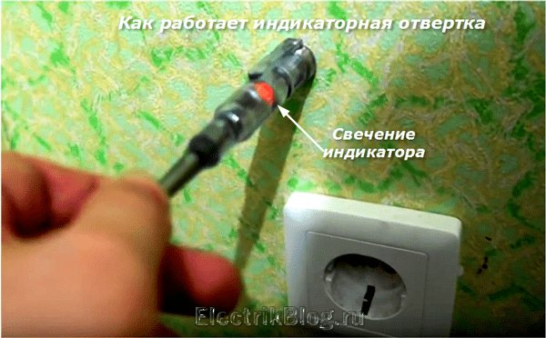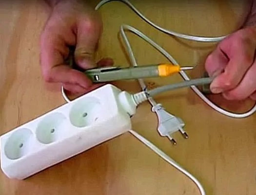 Le tournevis indicateur est pris par la piqûre, l'extrémité de la poignée (talon) est appliquée sur l'isolant de la rallonge branchée sur une prise de travail. La diode s'allume, la sonde est conduite sur toute la longueur du fil. À l'endroit où l'ampoule s'éteint, il y a un câble cassé.