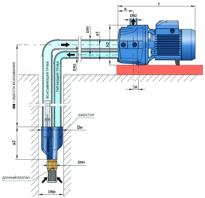 La même fonction de protection est assurée par un clapet anti-retour qui ne permet pas au liquide de quitter le tuyau et d'entrer dans le puits. Lors de la connexion d'une pompe de surface équipée d'un éjecteur, il est nécessaire d'en connecter une autre au tuyau d'aspiration, qui est connecté à l'éjecteur.