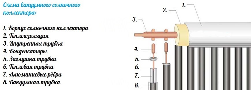 Le collecteur à tube en U est le plus efficace, mais l'installation est plus difficile. Les conduites d'écoulement lors de l'assemblage sont fixées par soudage avec des tubes de cuivre à l'intérieur de l'ampoule en verre. Il s'avère un seul système intégral avec une grande efficacité énergétique, mais une faible maintenabilité.