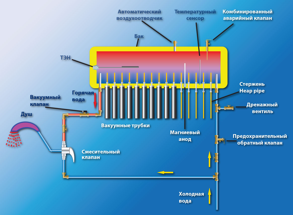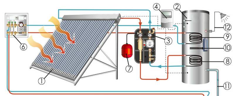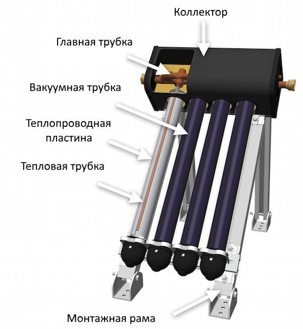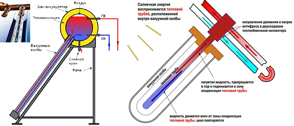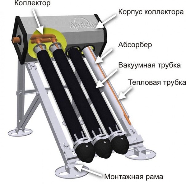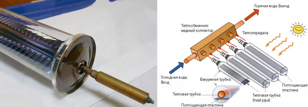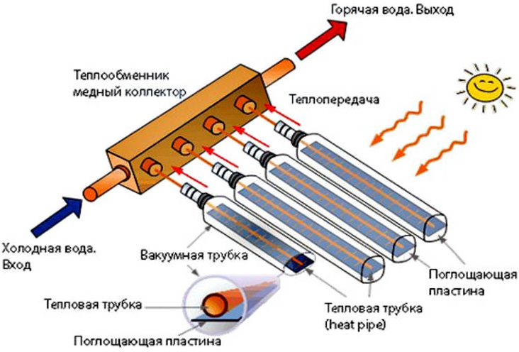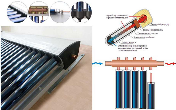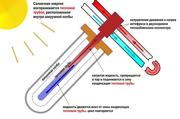 Le principe de fonctionnement d'un tel récepteur de chaleur est le même que celui du précédent, à une exception près - deux tubes de cuivre avec du liquide sont connectés à un échangeur de chaleur. Le système double permet une évacuation plus efficace de la chaleur, et la grande capacité et la surface des parois de l'échangeur de chaleur chauffent rapidement l'eau.