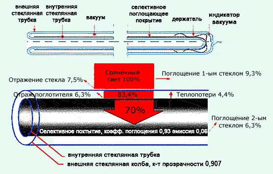 La plupart des fabricants remplissent l'espace inférieur entre les parois de verre avec du baryum - il absorbe les impuretés du gaz et améliore les propriétés d'isolation thermique. Son absence peut réduire l'efficacité du collecteur jusqu'à 15%.