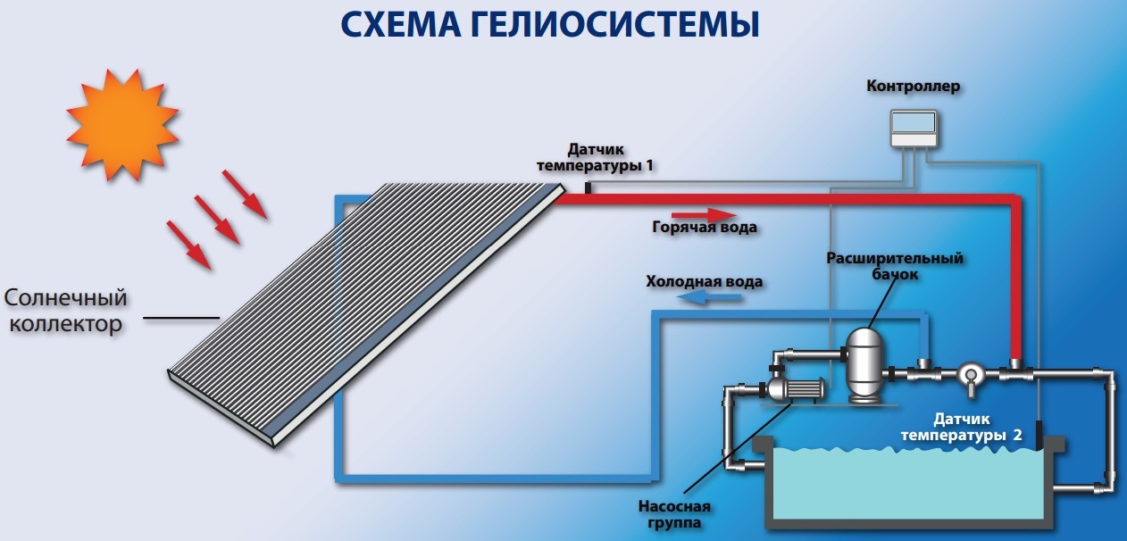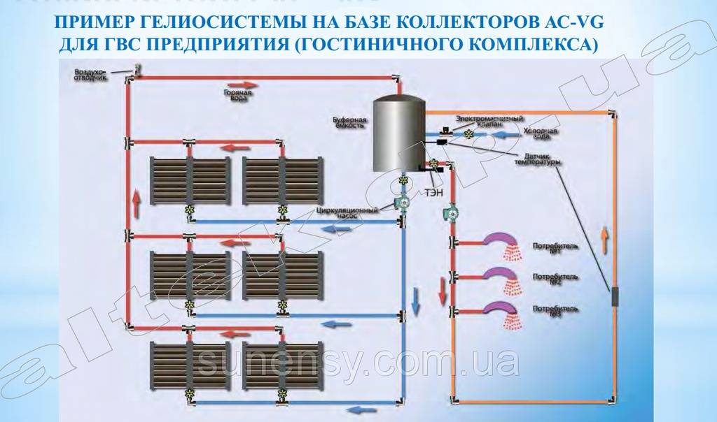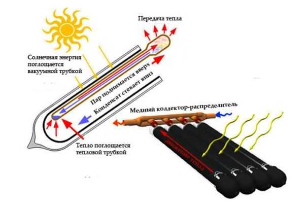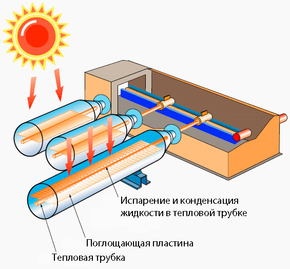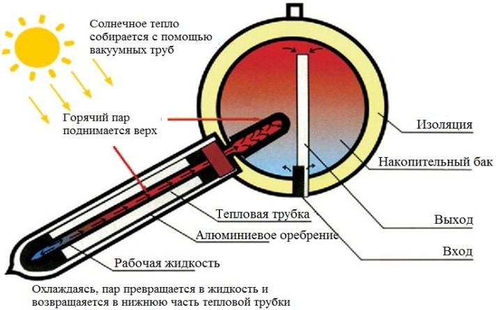 De plus, cette chaleur est transférée à la chaleur par des décapants ou des tiges en cuivre (ils existent en plusieurs types et ont une efficacité différente, nous les examinerons un peu plus tard). Les dissipateurs de chaleur transfèrent la chaleur à l'aide d'un caloporteur vers un réservoir d'accumulation.