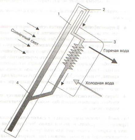 C'est le type de collecteur le plus simple et le moins cher. Il fonctionne comme suit : des tubes en cuivre sont situés dans le boîtier métallique, qui est traité à l'intérieur avec un absorbeur de plumes très efficace pour absorber la chaleur. Un liquide de refroidissement (eau ou antigel) y circule, qui absorbe la chaleur. De plus, ce liquide de refroidissement passe à travers un échangeur de chaleur dans le réservoir de stockage, où je transfère la chaleur directement à l'eau que nous pouvons utiliser, par exemple, pour chauffer une maison.