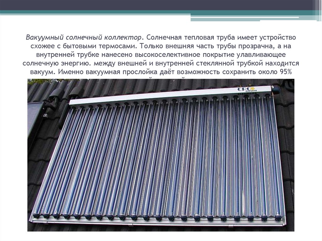 Il y a un vide entre les tubes, ce qui réduit la perte de chaleur à zéro et augmente l'efficacité du système.