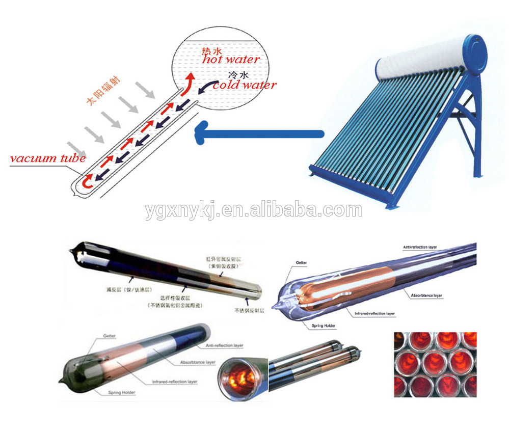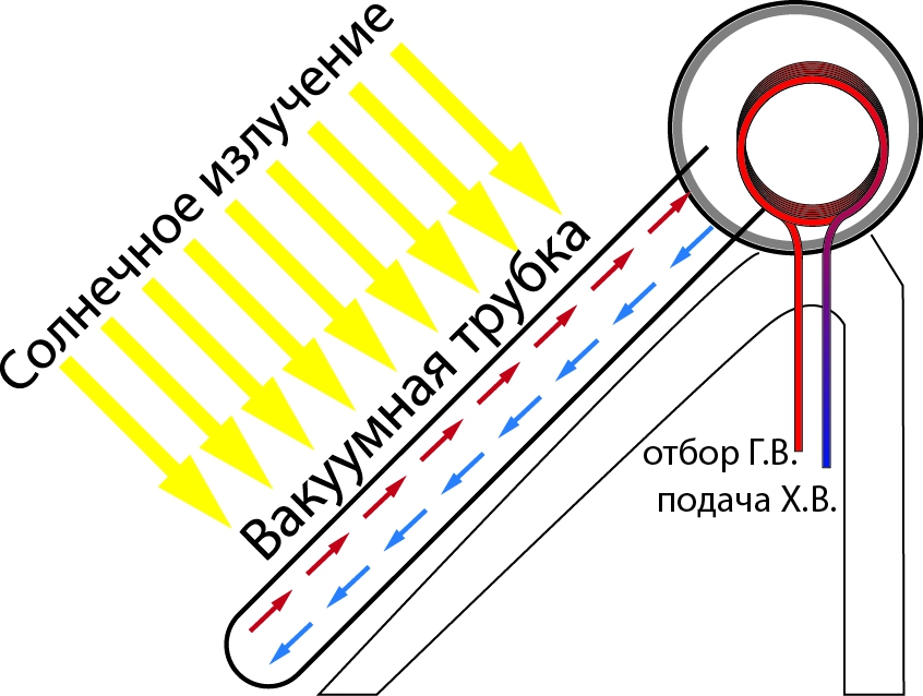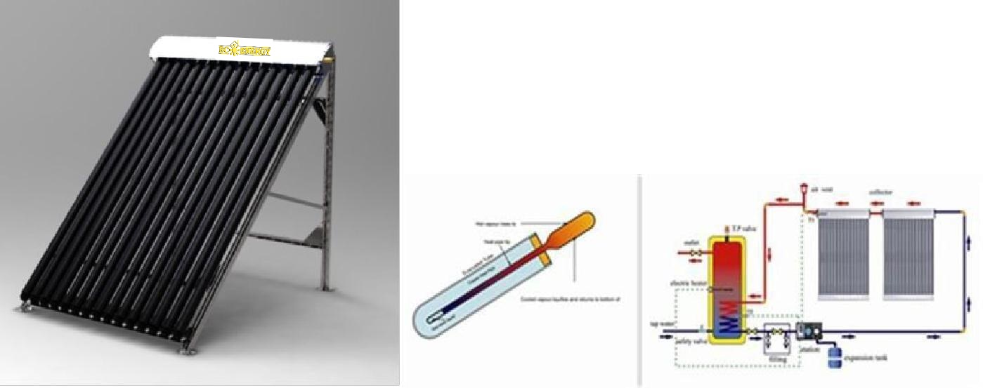 Ce type de tubes de capteurs solaires est utilisé dans les capteurs avec un réservoir de stockage externe. ils sont remplis d'eau et forment un volume avec le réservoir. L'eau chauffée du ballon monte dans le réservoir et l'eau refroidie tombe.