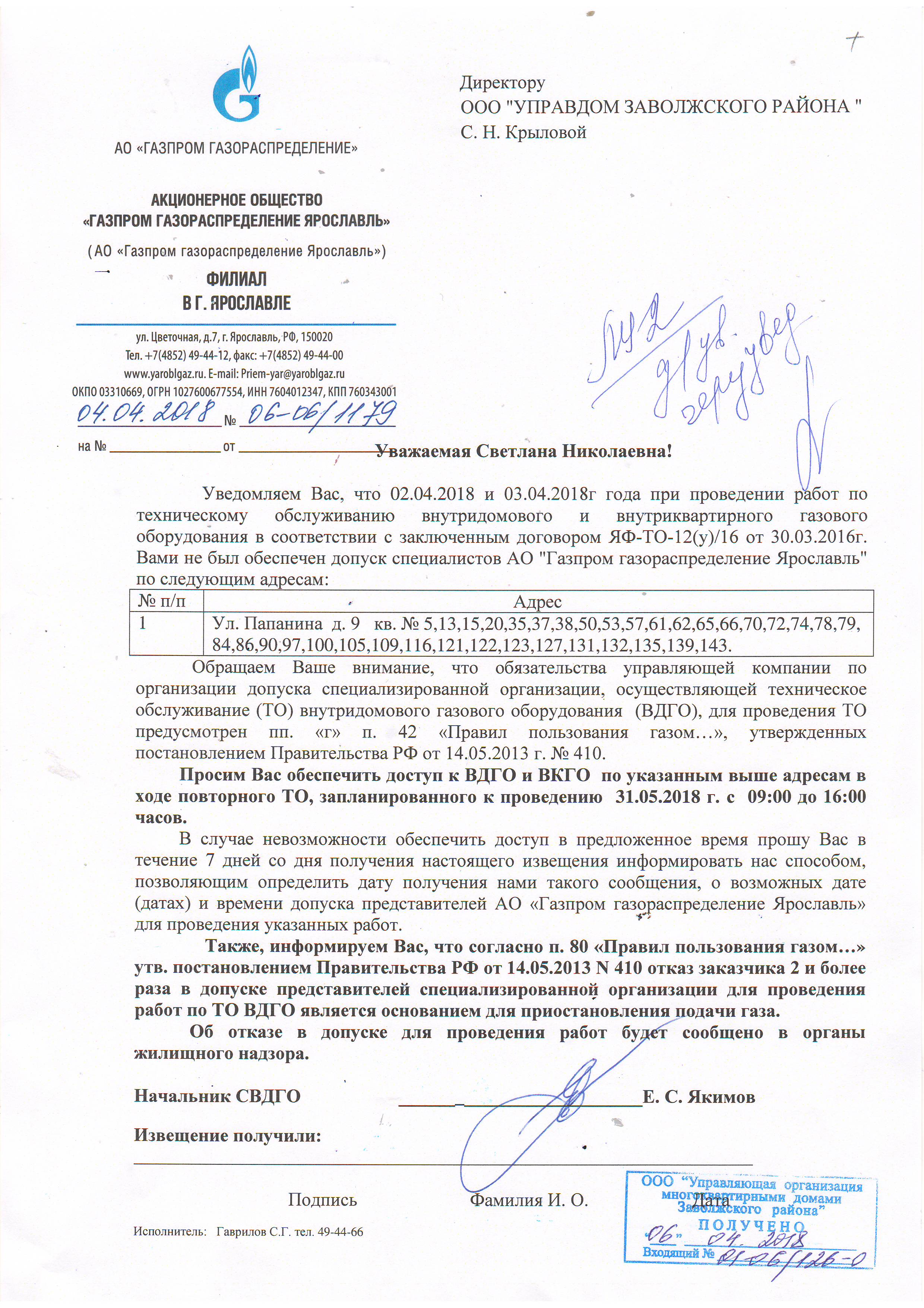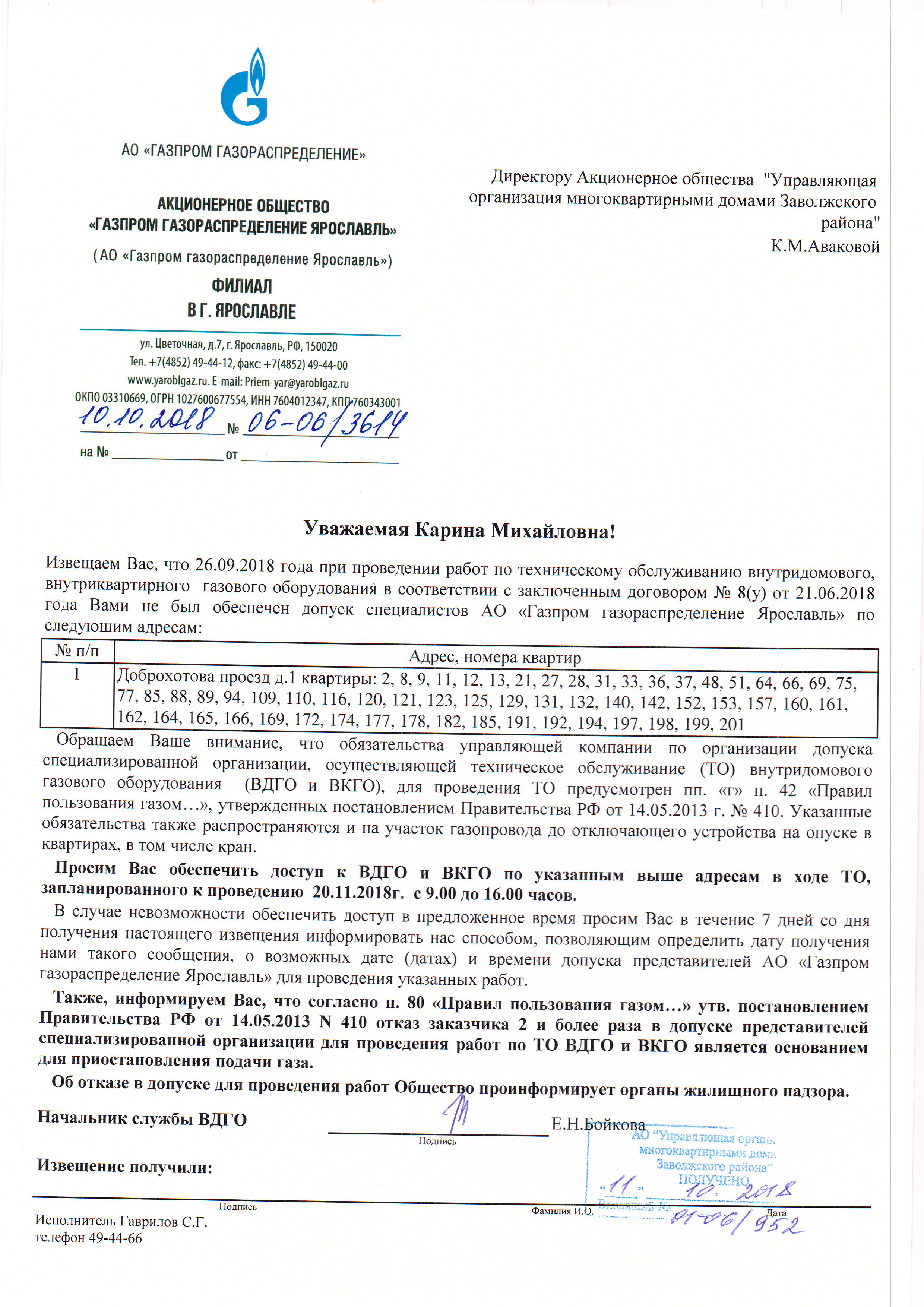 Les résidents doivent être informés de la réparation prévue d'un gazoduc ou d'un équipement à une station de distribution de gaz 20 jours à l'avance par courrier recommandé, qui précise le moment exact de l'arrêt de l'approvisionnement en gaz. Cependant, de telles situations sont extrêmement rares, car les travailleurs du gaz tentent de surveiller l'état des gazoducs et d'effectuer des réparations sans couper l'alimentation en carburant.