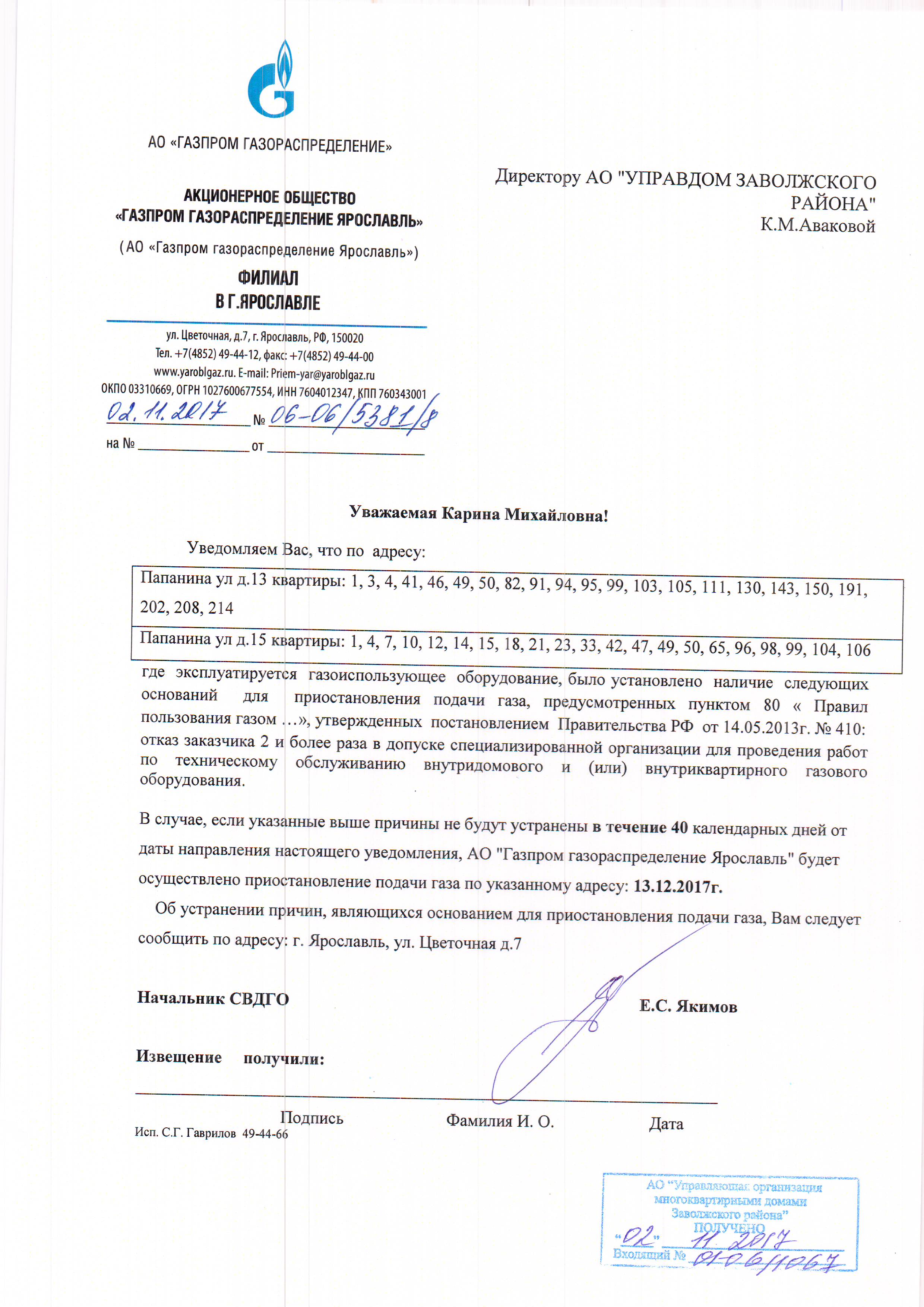 Une situation d'urgence menace la vie et la santé des résidents, par conséquent, en cas de menace d'accident, de fuite ou d'accident, conformément à l'article 77 du Règlement, approuvé. En vertu du décret n° 410, la société de distribution de gaz est tenue d'arrêter immédiatement la fourniture de gaz.