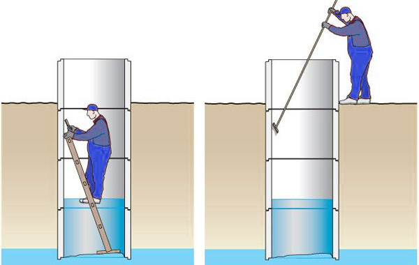 Dans une telle situation, comme avec la saturation du puits en dioxyde de carbone, les fumées toxiques, il vaut mieux ne pas essayer de faire le travail par vous-même. Où serait-il plus correct d'appeler des spécialistes qualifiés. Il n'est pas recommandé de rester debout à un moment donné pendant une longue période, cela peut entraîner une succion des jambes.Il est recommandé en cas de sol boueux ou gorgé d'eau de poser une plate-forme en bois, cela aidera à répartir uniformément le poids.