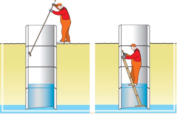 Avant de descendre, il convient de vérifier si des gaz dangereux se sont accumulés en dessous. Cela se fait en abaissant un seau avec une bougie allumée; la déviation de sa flamme sur le côté, l'extinction ou un changement de couleur du feu indiquent un danger. Les spécialistes expérimentés descendent toujours avec un casque et des bottes en caoutchouc. Ceux qui souffrent de maladies cardiaques et vasculaires, de vertiges périodiques, il vaut mieux ne pas monter dans les puits, surtout si la profondeur dépasse 3 m.Vous devez absolument vous procurer une corde ou une simple échelle, après vous être assuré de leur fiabilité.