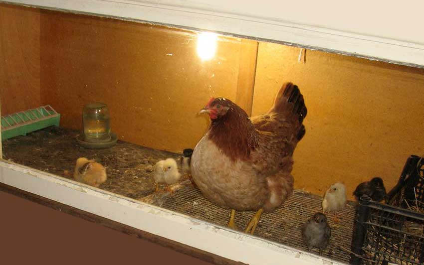 Dans ce cas, vous devez faire attention à la couveuse (couvée anglaise - s'asseoir sur des œufs) - une maison pour poulets, spécialement équipée et organisée pour l'élevage de jeunes animaux. L'éleveuse doit être équipée de :