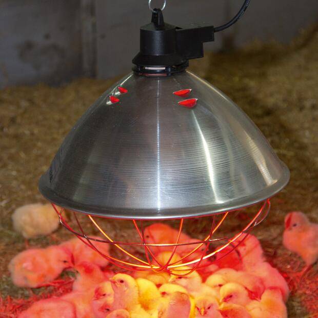 Il s'agit d'une méthode courante pour réchauffer une couveuse. Une telle lampe émet de l'énergie dans le domaine du rouge et de l'infrarouge. Il est conçu pour émettre un éclairage chaud et assez doux. Appeler un tel appareil universel n'en vaut pas la peine, bien que les experts disent souvent que les lampes rouges n'empêchent pas les poussins de dormir et de se reposer normalement.