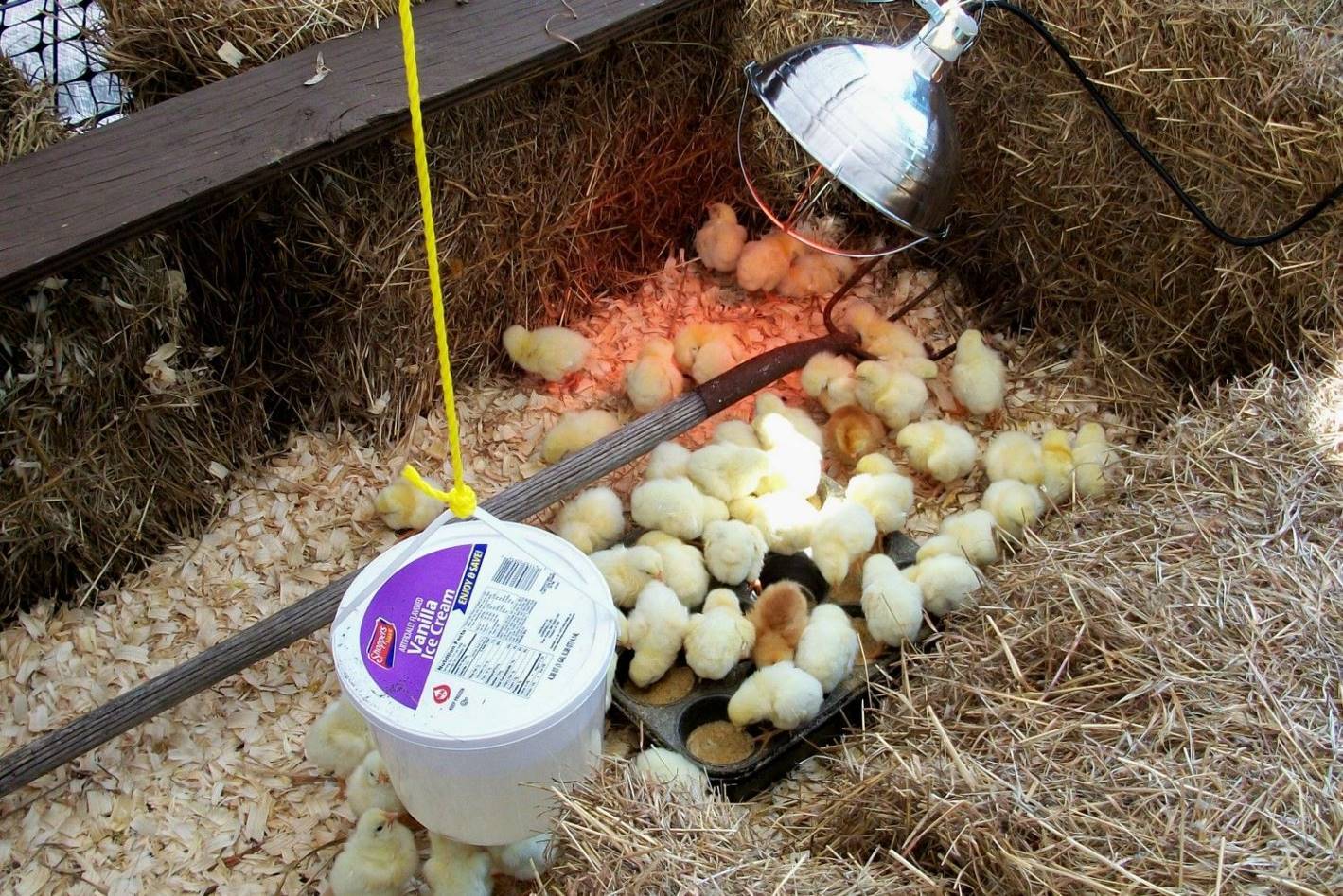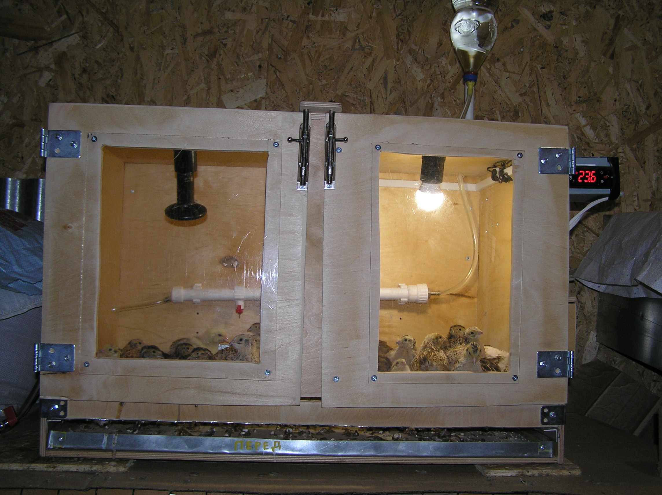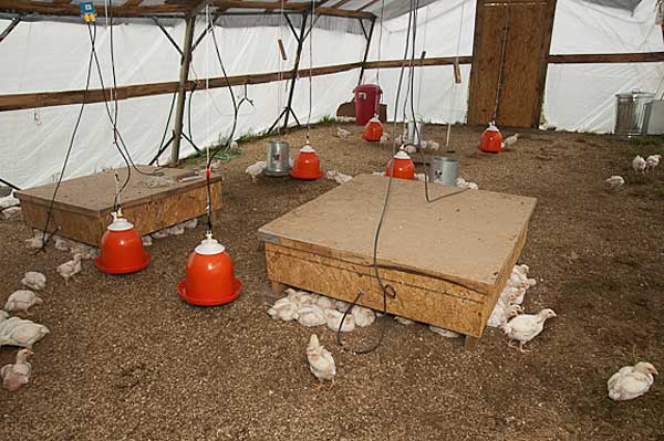 Le type de structure et ses dimensions peuvent varier considérablement en fonction du type de volaille élevée, ainsi que de sa quantité. Le sol ne doit pas être glissant et humide et une palette doit être placée en dessous. Une condition préalable est la présence d'une ventilation de haute qualité en l'absence de courants d'air. La source de chauffage est le plus souvent une lampe fluorescente fermée.