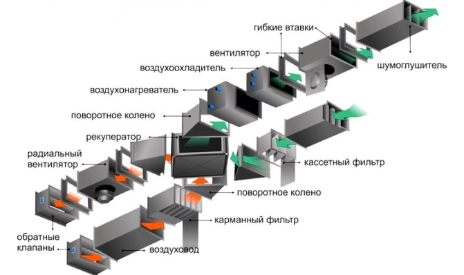 Ventilation à faire soi-même avec chauffage: les nuances du chauffage de l'air + instructions de montage du systèmeIl existe de nombreux schémas et méthodes pour placer l'équipement et organiser l'échange d'air. Le choix d'un schéma spécifique dépend du type de local (appartement, maison individuelle, bureau), des dimensions du système, de son équipement (lire ici comment aménager la ventilation dans un appartement).