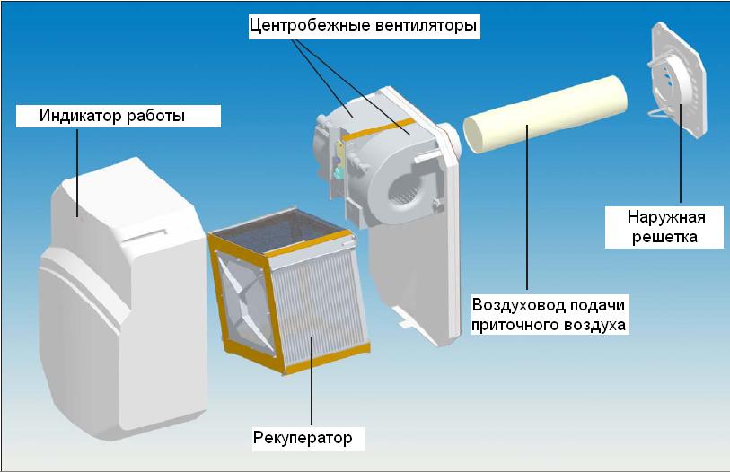 Fait référence au type passif de ventilation d'alimentation. Une telle installation a un boîtier compact qui est monté sur le mur. Pour contrôler le chauffage, il est équipé d'un écran LCD et d'un panneau de commande. Le principe de fonctionnement est de récupérer les masses d'air internes et externes. Pour chauffer la pièce, cet appareil est placé à proximité du radiateur de chauffage.